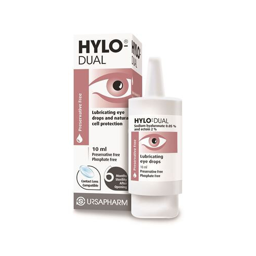 HYLO-DUAL kapi za oči imaju dvostruko delovanje zbog prisustva natrijum-hijaluronata i ektoina. Obezbeđuju intenzivnu lubrikaciju rožnjače i konjuktive i sprečavaju prekomerno isparavanje suznog filma. Stabilizovani suzni film (posebno lipidni sloj) ublažava iritaciju i suvoću oka, kao i simptome upale ili one izazvanim alergijom, poput peckanja i svraba. Ne sadrže konzervanse i kompatibilne su sa svim kontaktnim sočivima.