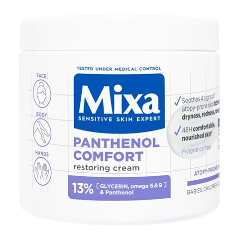 Mixa Panthenol Comfort umirujuća krema za obnavljanje zaštitne barijere kože za lice, telo i ruke za kožu sklonu atopiji, za bebe, decu i odrasle. Sadrži 13% glicerin, omega 6 i 9, pantenol – bez mirisa, hipoalergeno, 98% prirodno, 100% osetljiva koža, za kožu sklonu atopiji. Deluje na 4 znaka kože sklone atopiji: osećaj svraba, crvenilo, hrapavost i suvoća. 48-časovni osećaj prijatnosti. Testirano pod medicinskom kontrolom; Klinički dokazani rezultati na osetljivoj koži.