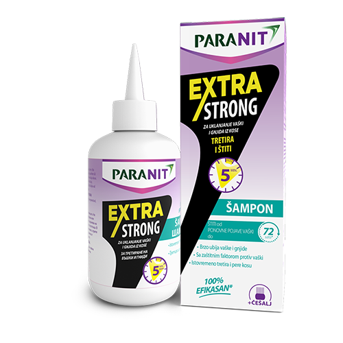 Paranit Extra Strong Šampon za tretman protiv vaški. Istrebljuje vaške nakon samo 5 minuta i gnjide nakon 10min. Klinički dokazana efikasnost. Ima trostruko delovanje: