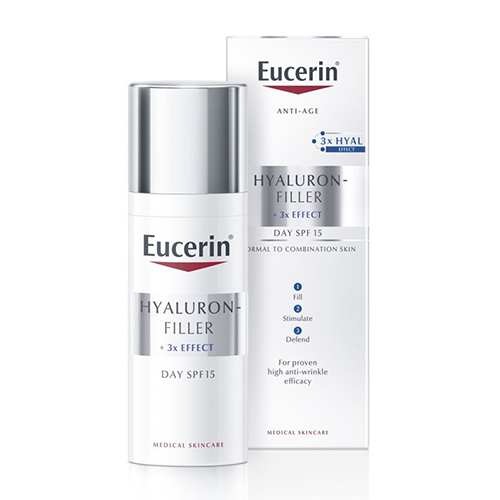 Eucerin Hyaluron-Filler Dnevna krema za normalnu i mešovitu kožu SPF15 deluje protiv prvih znakova starenja kože. Vidljivo popunjava fine linije i bore pružajući podmlađen izgled i štiti od prevremenog starenja uzrokovanog UV zracima. Jedinstvena kombinacija hijaluronske kiseline dugog i kratkog lanca i glicin saponina vidljivo popunjava čak i duboke bore. Hijaluronska kiselina dugog lanca poboljšava hidrataciju i popunjava površinske bore, dok hijaluronska kiselina kratkog lanca prodire dublje, u epidermalne slojeve kože gde duboke bore nastaju. Aktivni glicin saponini stimulišu sintezu prirodne hijaluronske kiseline u ćelijama kože tamo gde se najdublje bore formiraju. Sa SPF 15 + i UVA filterima, ova krema pruža efikasnu zaštitu od prevremenog starenja i produbljivanja bora.