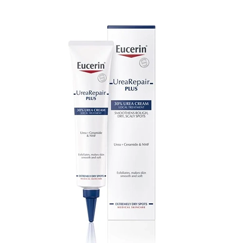 Eucerin UreaRepair PLUS krema sa 30% uree pruža izrazito suvoj koži intenzivnu negu koja joj je potrebna. Formulacija sadrži jedinstvenu kombinaciju: visoku koncentraciju 30% uree koja vrši eksfolijaciju, ceramide koji obnavljaju barijernu funkciju kože, kao i prirodne vlažeće faktore (PVF), koji obezbeđuju hidrataciju i zadržavanje vode unutar kože. Koža je intenzivno hidrirana i izgleda glatko i meko. Intenzivni tretman s ureom nanosi se samo lokalno, na problematične regije, a ne na celo telo. Klinička i dermatološka ispitivanja pokazuju kako je koža vidljivo mekša nakon jedne nedelje primene, uz kontinuirano poboljšanje uz redovnu primenu. Ova krema pogodna je za područja obuhvaćena hiperkeratozom (medicinski pojam za zadebljanje kože) i za osobe sa psorijazom i keratosis pilaris. Takođe, može da se koristi kao dodatna nega uz propisanu terapiju. Kremu sa 30% uree ne bi trebalo koristiti na otvorenim ranama.