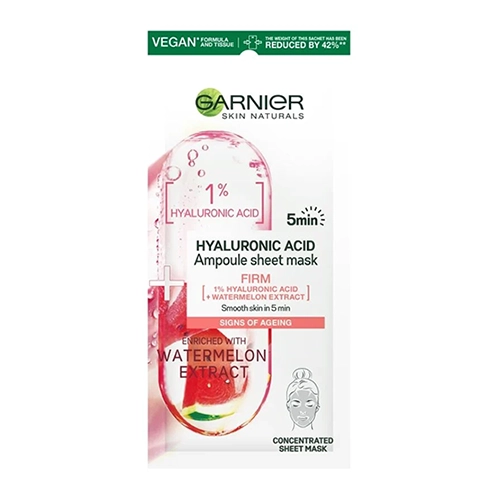 HYALURONIC ACID Ampule sheet maska za lice, za zatezanje kože, obogaćena hijaluronskom kiselinom i ekstraktom lubenice. Za 5 min, pruža osećaj zategnute, revitalizirane kože. Bez sastojaka ili sporednih proizvoda životinjskog porekla.