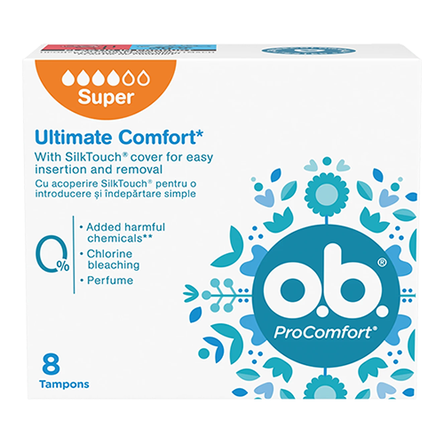 o.b. Procomfort Super tamponi pružaju udobnost i sigurnu zaštitu. o.b. PROCOMFORT obezbeđuje lakše postavljanje i SILKTOUCH lakše uklanjanje. Revolucionarna DYNAMICFIT tehnologija 3D omogućava pouzdanu zaštitu, da se tečnost ravnomerno rasporedi. o.b. Procomfort Super tamponi preporučuju se jaka menstrualna krvarenja.