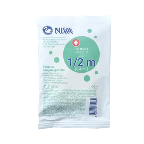 Gaza sterilna 1/2m izrađuje se od beljene pamučne gaze. Koristi se u zdravstvu. Kao sterilan proizvod može se staviti direktno na ranu.