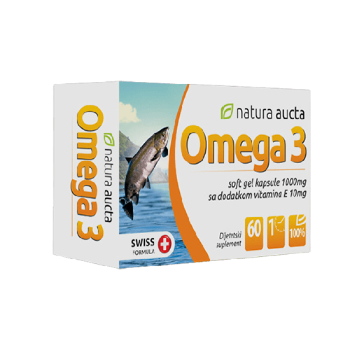 NATURA AUCTA OMEGA 3, soft gel kapsule 1 000 mg, sa dodatkom vitamina E 10 mg, je dodatak ishrani i predstavlja izvor Omega-3 masnih kiselina. Ovaj proizvod je namenjen za regulaciju holesterola i poboljšanje rada kardiovaskularnog sistema
