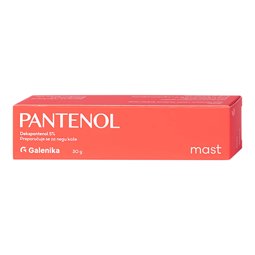 Galenika PANTENOL mast sadrži 5% dekspantenola. Mast se preporučuje za negu kože nakon sunčanja, kod iritacije i ojeda, posebno na pregibima kože. Idealna je i za negu suvih, ispucalih usana i bradavica dojki dojilja, kod atopične, iritirane kože u pauzama između tretmana lekovitim mastima. Galenika PANTENOL mast se može koristiti i za negu lokalizovanih regije na licu i telu: suva i ispucala koža ruku i zanoktice, ispucale pete i stopala. Možete je koristiti i za za negu starije, suve i umorne kože lica kao i negu kože kod poremećaja periferne cirkulacije krvi.